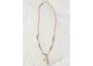 ピンクベージュとアンティーク調なゴールドのビーズ、ガラスビーズ、淡いベージュ色のコットンタッセルのネックレス。